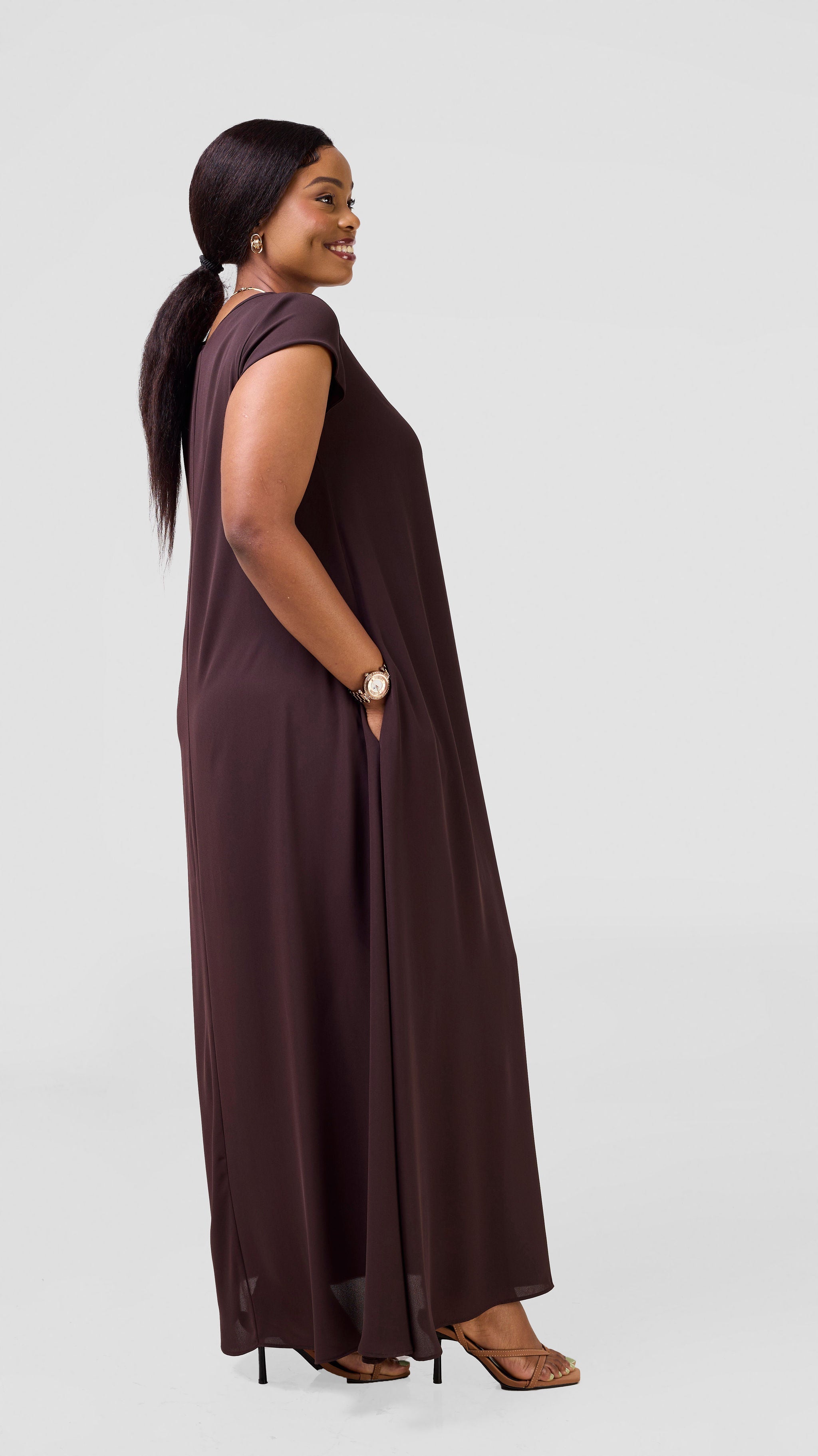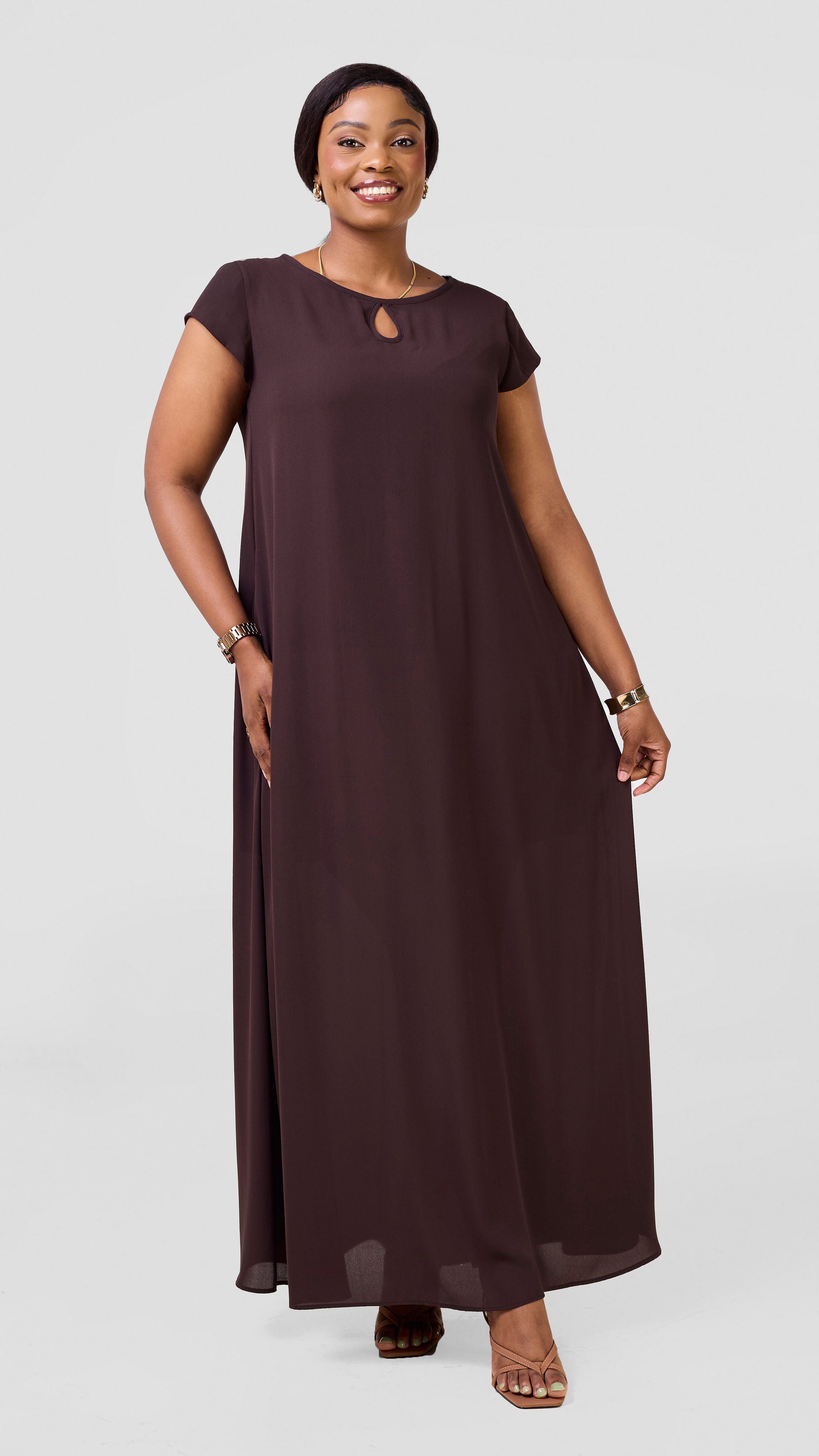 The Vivo Sierra Maxi Chiffon Dress in Chocolate offers airy elegance with its flowing chiffon fabric, perfect for warm days and special occasions. Its maxi length provides graceful coverage, while the rich rust hue adds a warm, earthy touch to your wardrobe. Designed for comfort and style, this dress supports your confidence wherever you wear it.