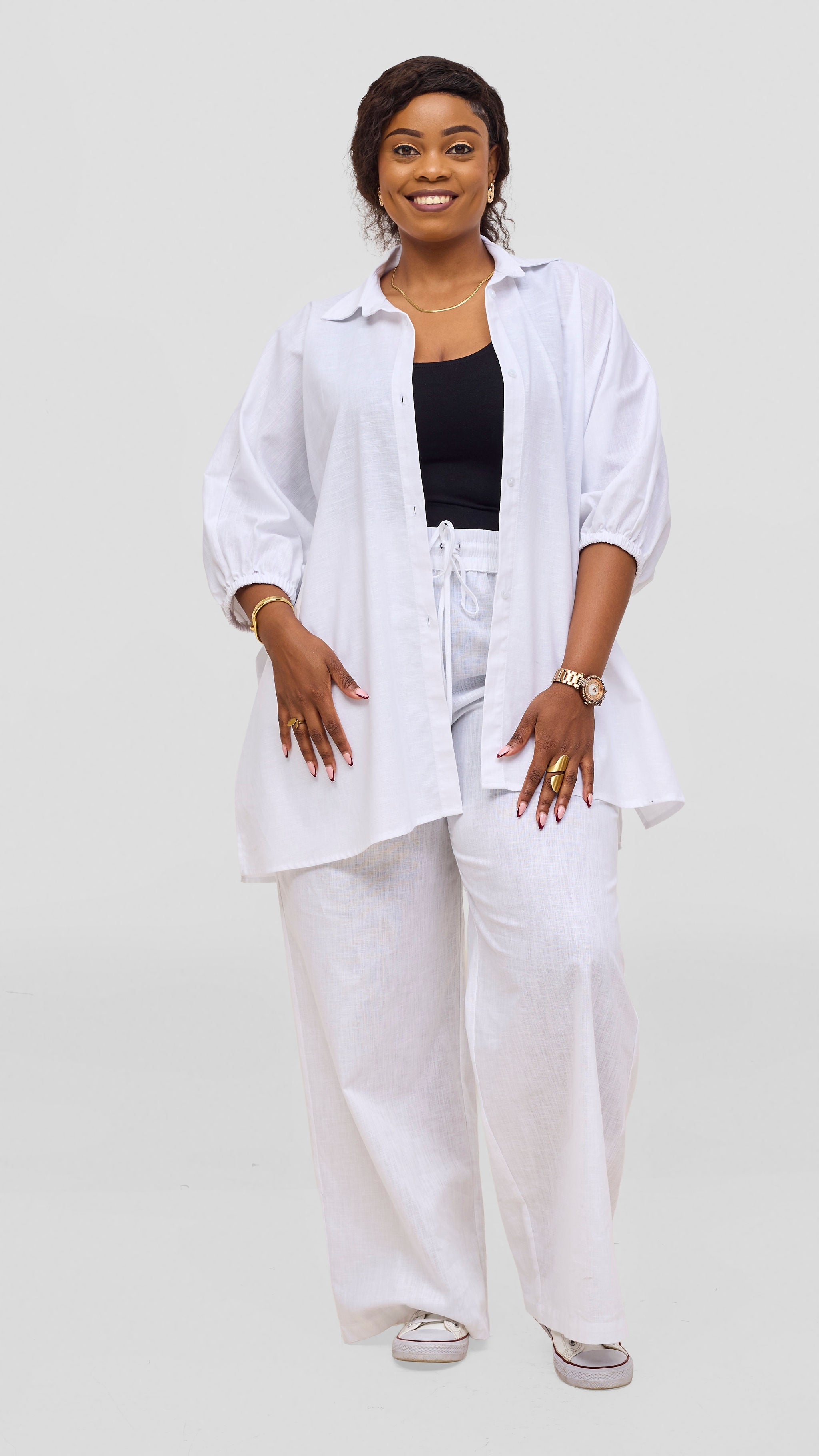 Elevate your wardrobe with these refined Vivo Liora Drawstring Pants in crisp white. Designed with a relaxed silhouette and adjustable drawstring waist, they offer effortless comfort without compromising on style. The clean, neutral palette makes them remarkably versatile pair them seamlessly with the matching Liora Kimono Shirt for a coordinated, polished ensemble, or mix with your existing pieces for understated elegance. Perfect for those who appreciate minimalist sophistication and quality craftsmanship.