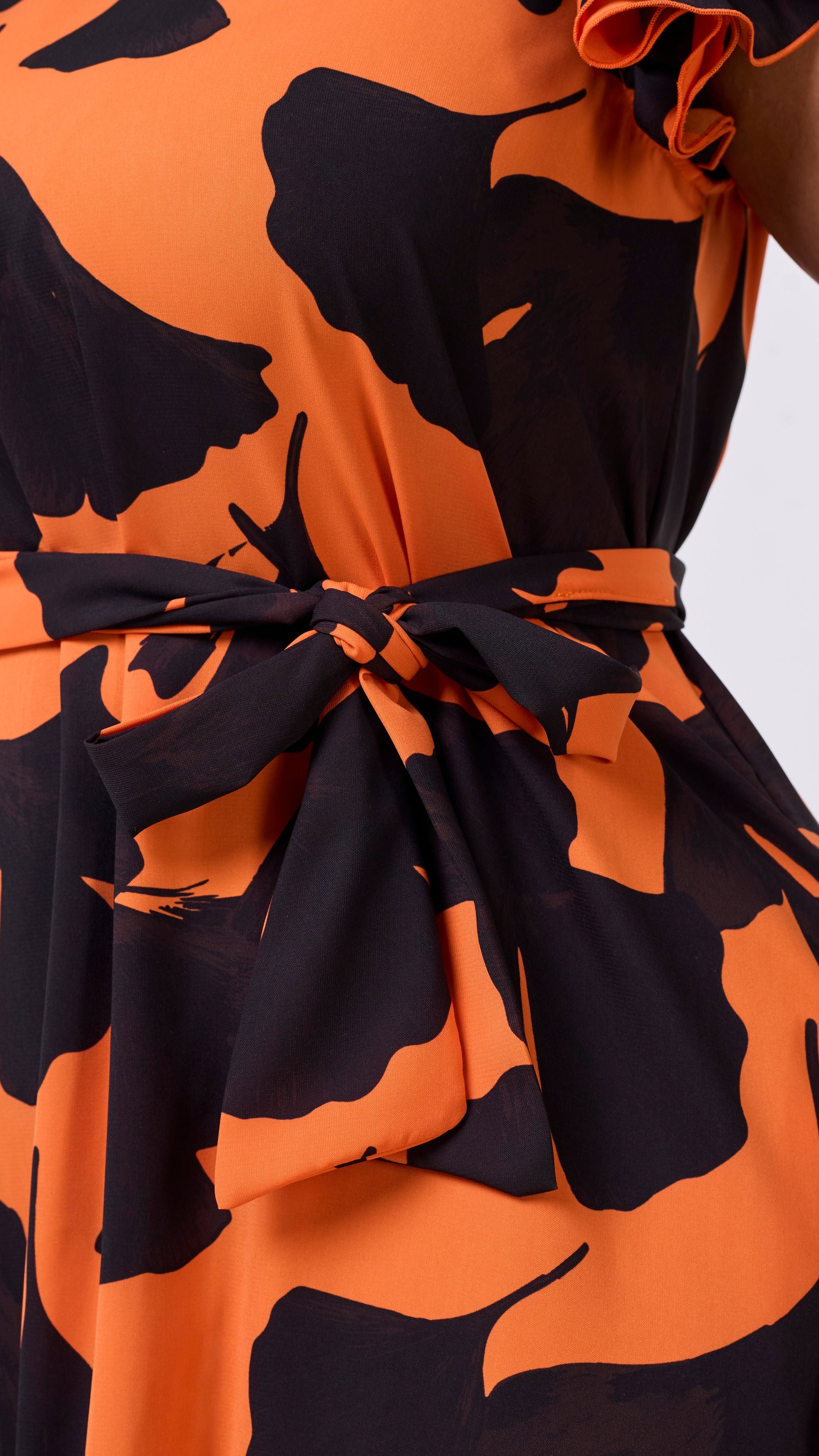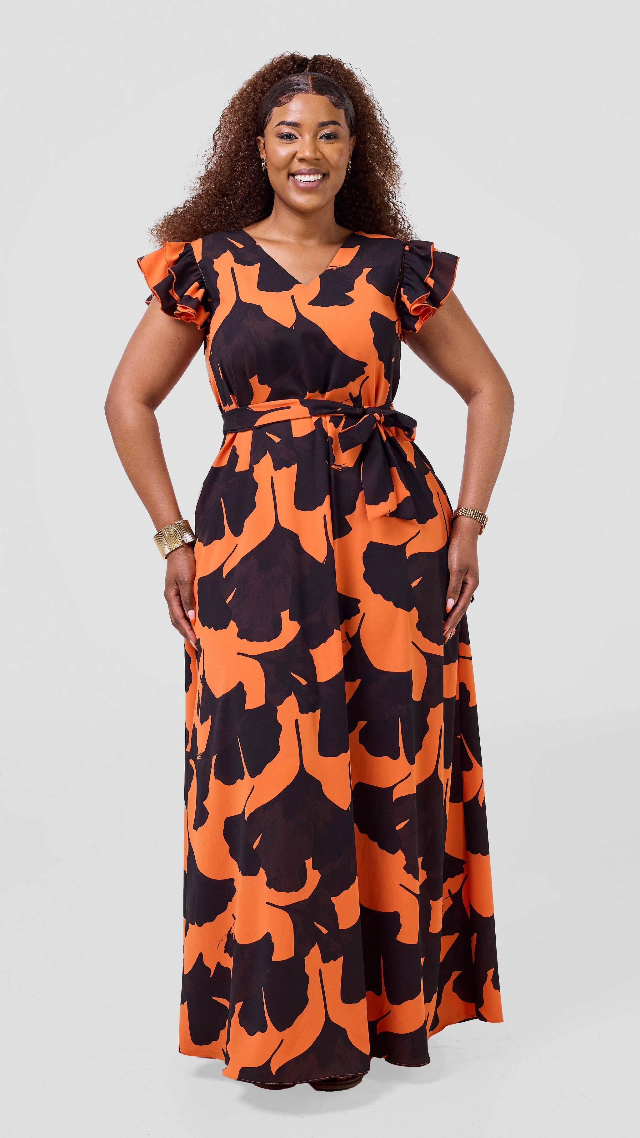 The Vivo Nasinka A-Line Maxi Dress in Orange with an Black Tilla print combines comfort and style effortlessly. Its ruffle sleeves add a charming touch, while the waist belt ensures a flattering fit. Perfect for both casual outings and special occasions, this dress offers a breezy, elegant look that supports your confidence throughout the day.