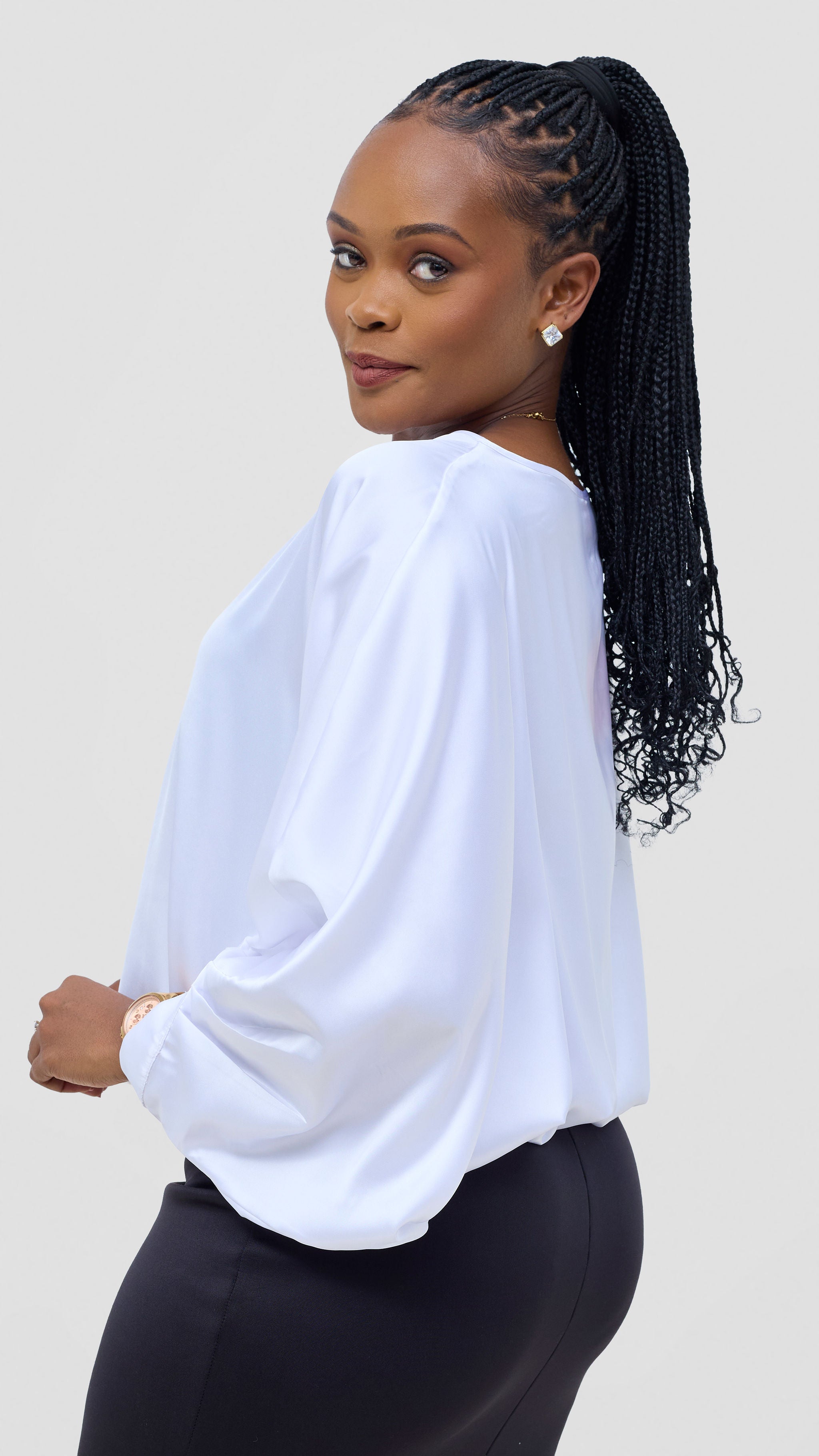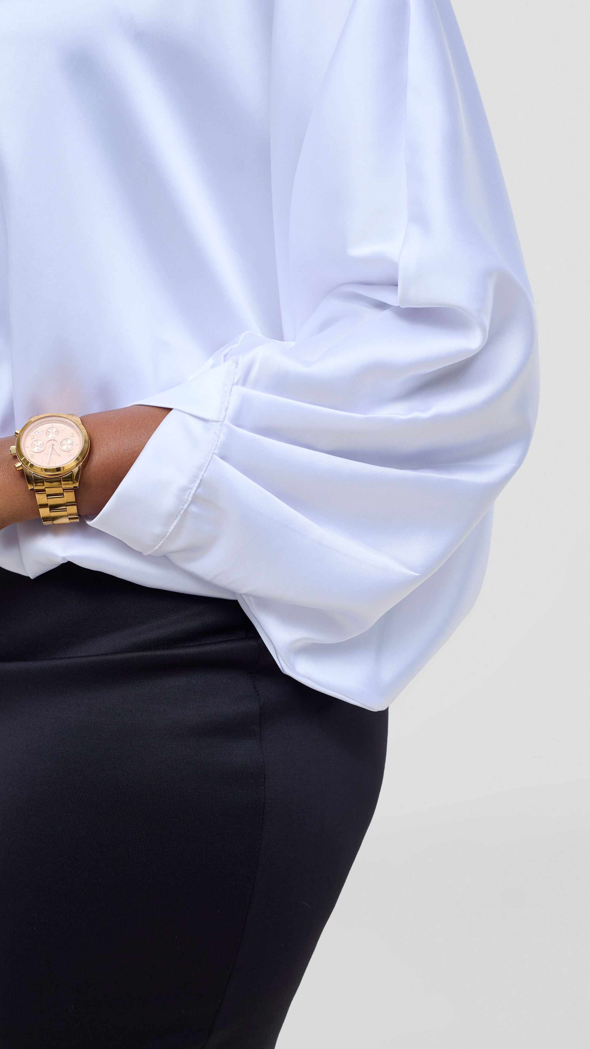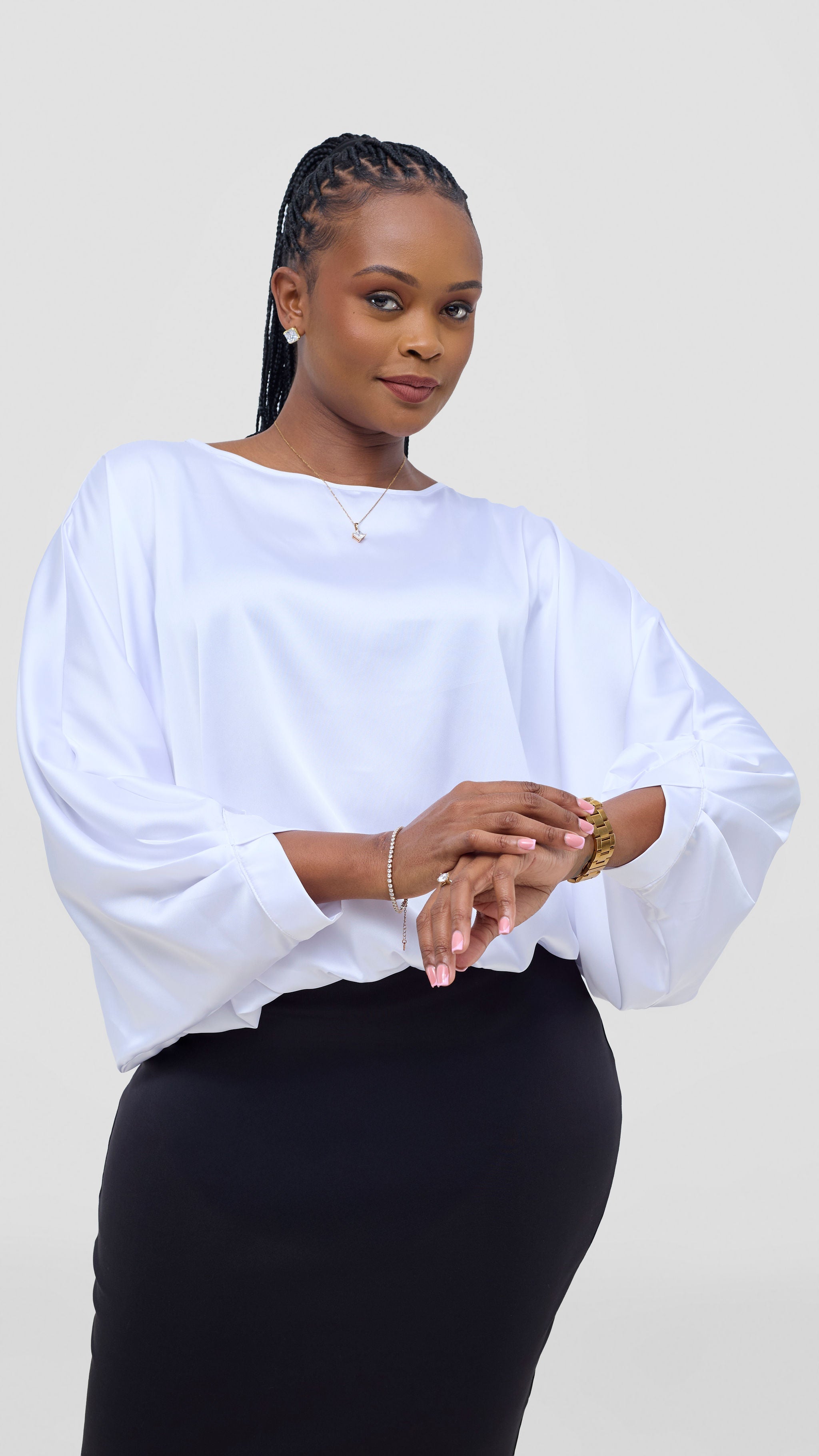 Experience the freedom of one top that does it all. This crossed cuff batwing top in crisp white is designed for the modern woman who values both style and practicality. The flowing batwing sleeves offer an elegant silhouette while the crossed cuff detail brings understated sophistication. Transition effortlessly from Monday meetings in tailored pants or a skirt to weekend adventures in your favorite jeans or leggings. Comfortable, flattering, and endlessly adaptable, this piece becomes the reliable foundation of a wardrobe that keeps up with your dynamic life. True versatility, beautifully executed.