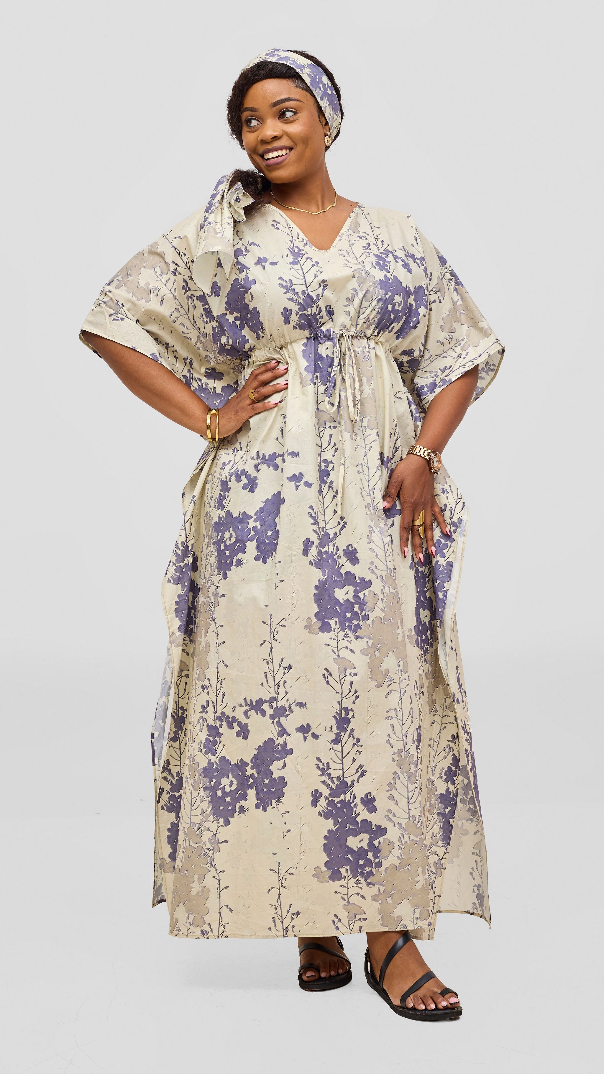 Embrace effortless elegance with this cotton kaftan, crafted from breathable fabric that moves with you. The wide drawstring silhouette offers flattering comfort while the striking cream and lilac print adds visual intrigue to your wardrobe. Perfect for leisurely afternoons or casual gatherings, this versatile piece transitions seamlessly from day to evening wear. A timeless addition to any collection seeking understated sophistication.