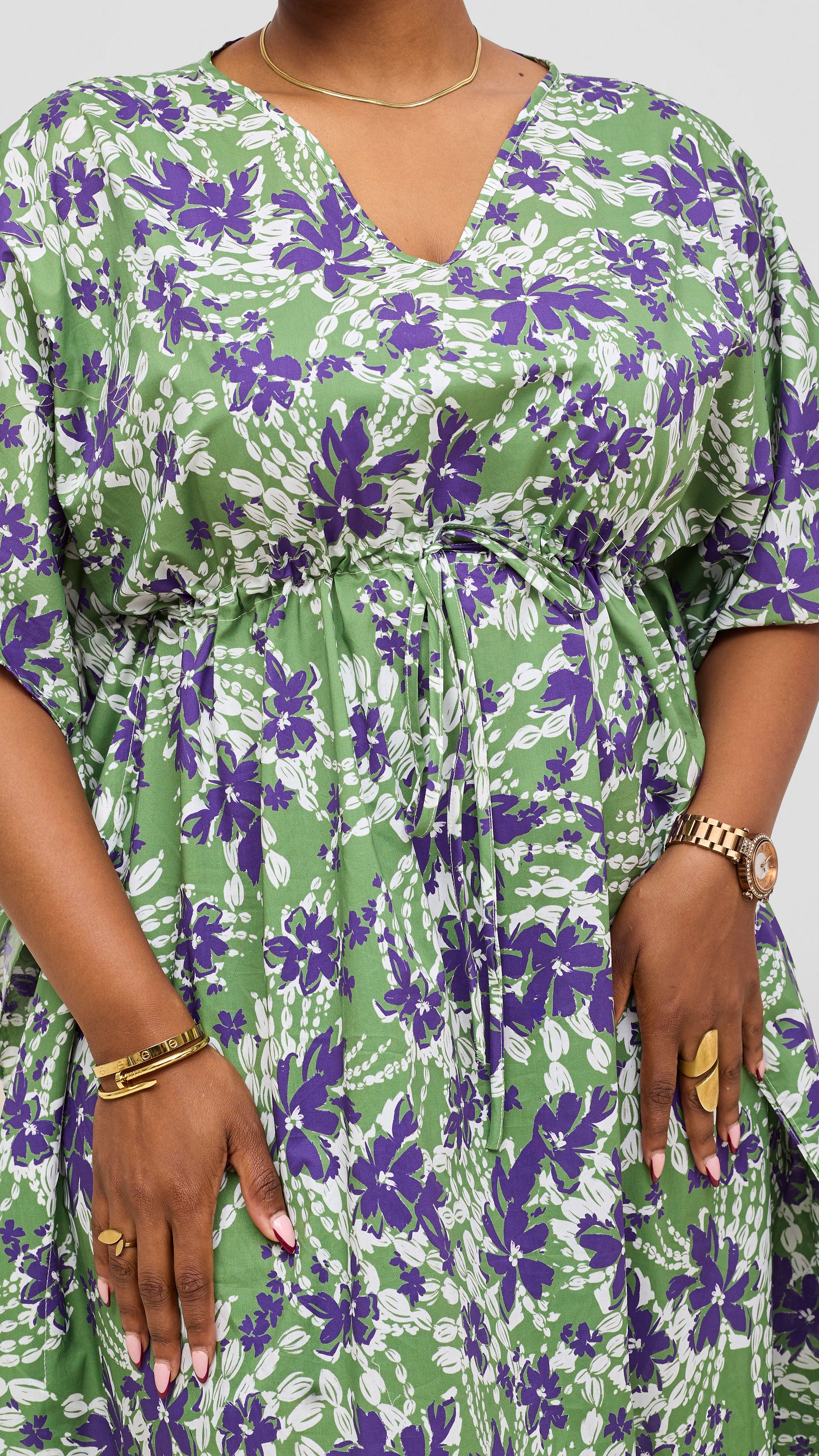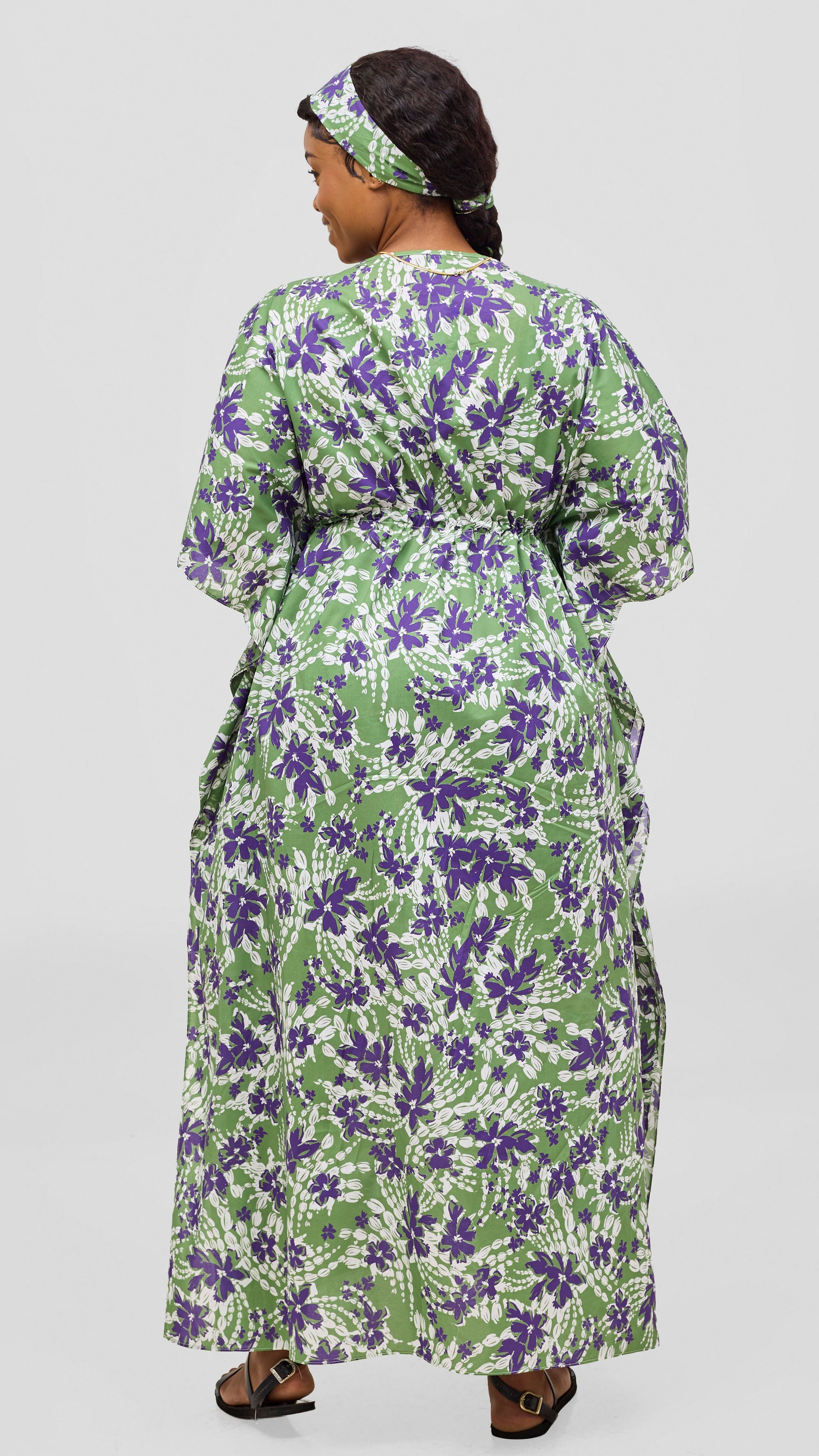 Embrace effortless elegance with this cotton kaftan, crafted from breathable fabric that moves with you. The wide drawstring silhouette offers flattering comfort while the striking green and purple print adds visual intrigue to your wardrobe. Perfect for leisurely afternoons or casual gatherings, this versatile piece transitions seamlessly from day to evening wear. A timeless addition to any collection seeking understated sophistication.