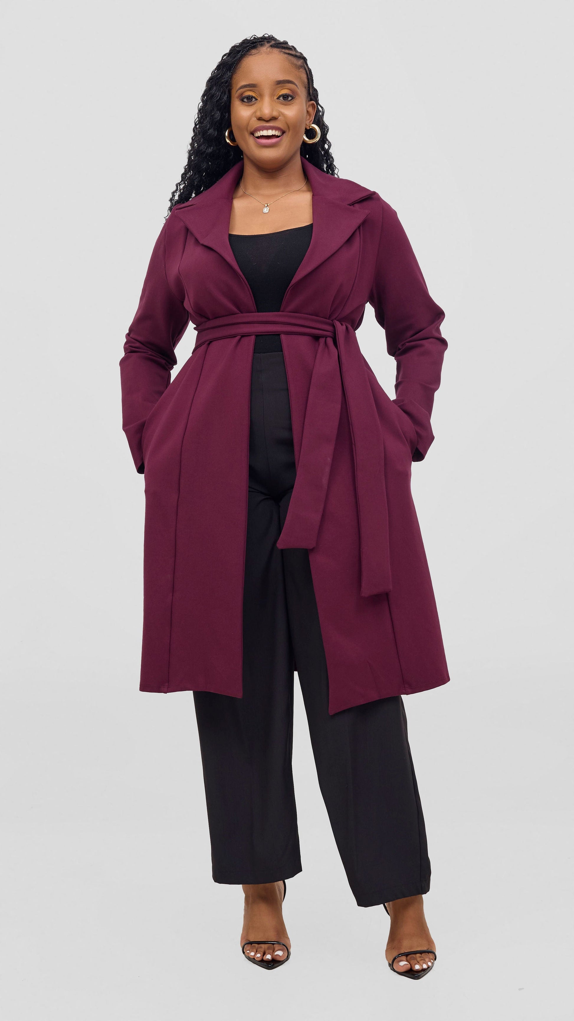 The Vivo Aleri Coat in rich burgundy offers versatile style with a tailored belt that defines your silhouette, while functional pockets add convenience. Its design transitions effortlessly from casual to formal settings, making it an essential layering piece for refined, adaptable wardrobe looks.