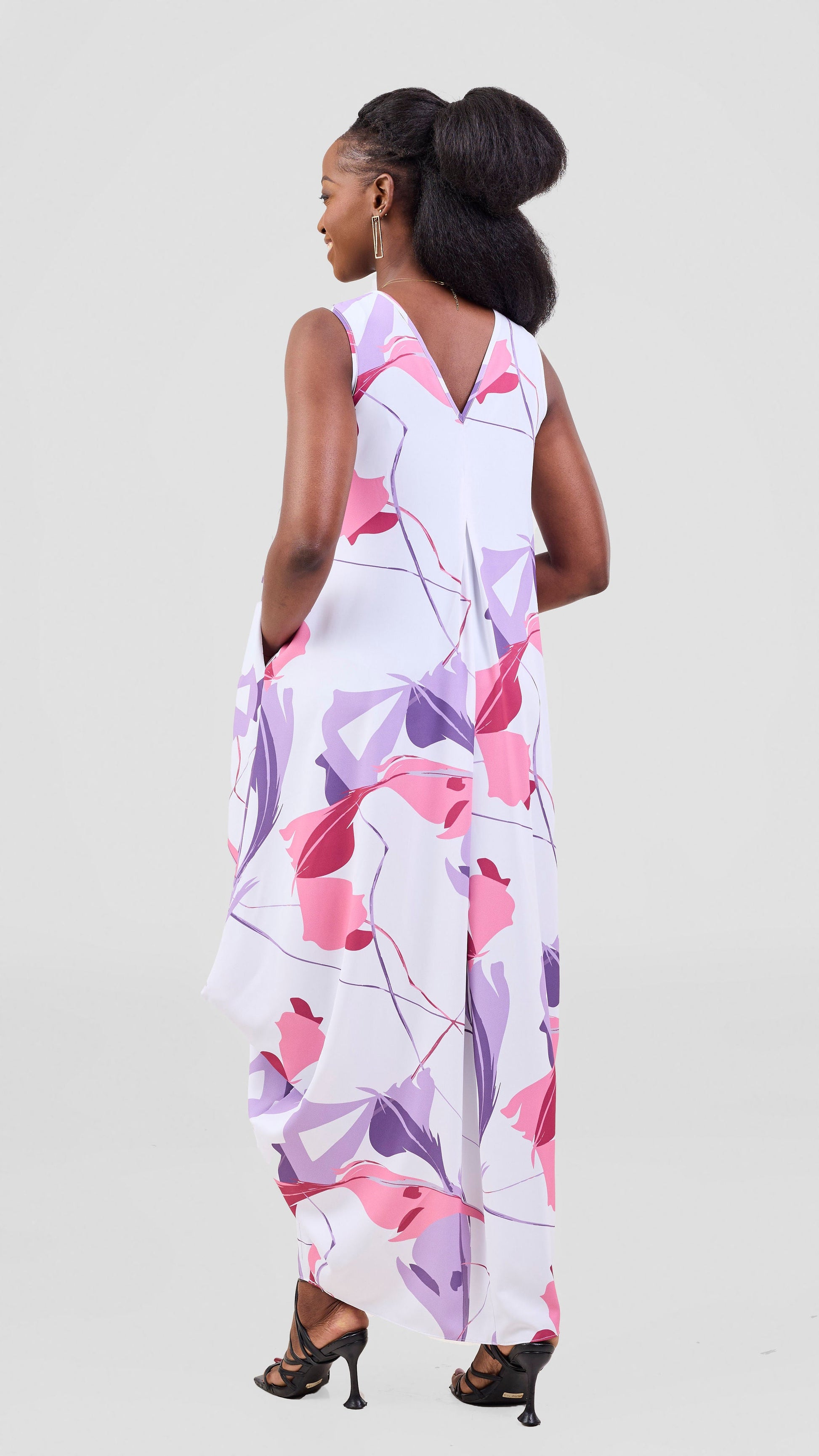 Vivo Kemi Side Cowl Maxi Dress - White / Purple Emi Print